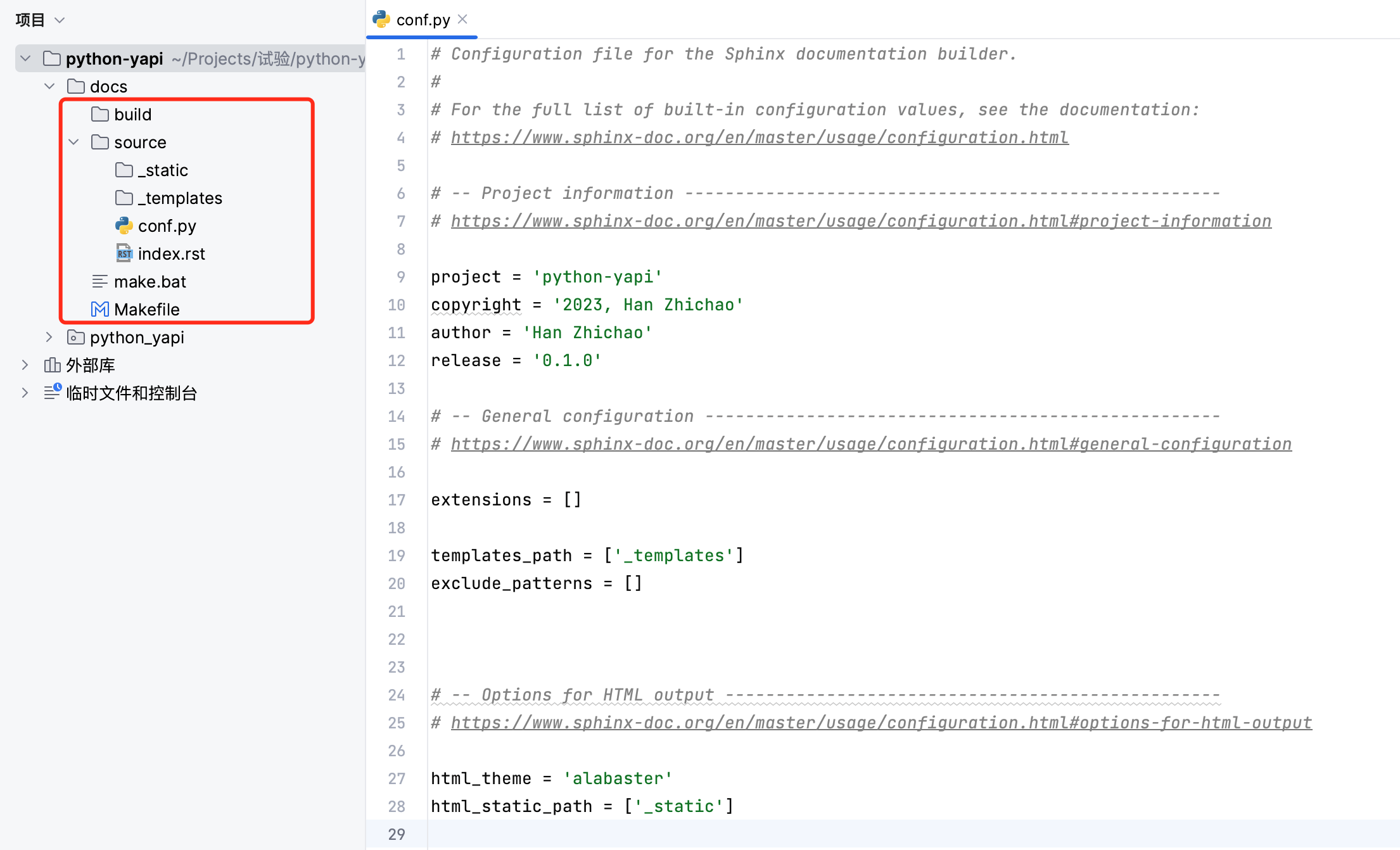 source中包含了sphinx的配置文件conf.py以及文档首页index.rst。